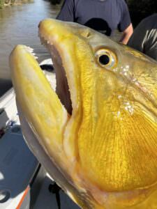 Though usually confused due to its name or aspect, the Golden “Dorado” is not a Salmon or a Mahi Mahi. The Salminus maxillosus or brasiliensis, often referred to as the “River Tiger”, is considered one of the most aggressive freshwater species on the planet. It inhabits the tropical basins of South America. It typically ranges from 5 to 10 pounds. It is a quick swimmer. Unpredictable and wary, always offers a tough fight, striking baits fiercely with its razor teeth while it jumps high and jerks hard.